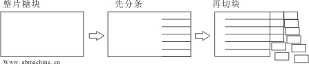 - 专用于牛皮糖,牛轧糖,米花糖的切块。整片糖块放置于机器上,自动分条,并切块;此机最大的优点是机器平稳,效率高,整片糖块随时放随时切,长度精确。